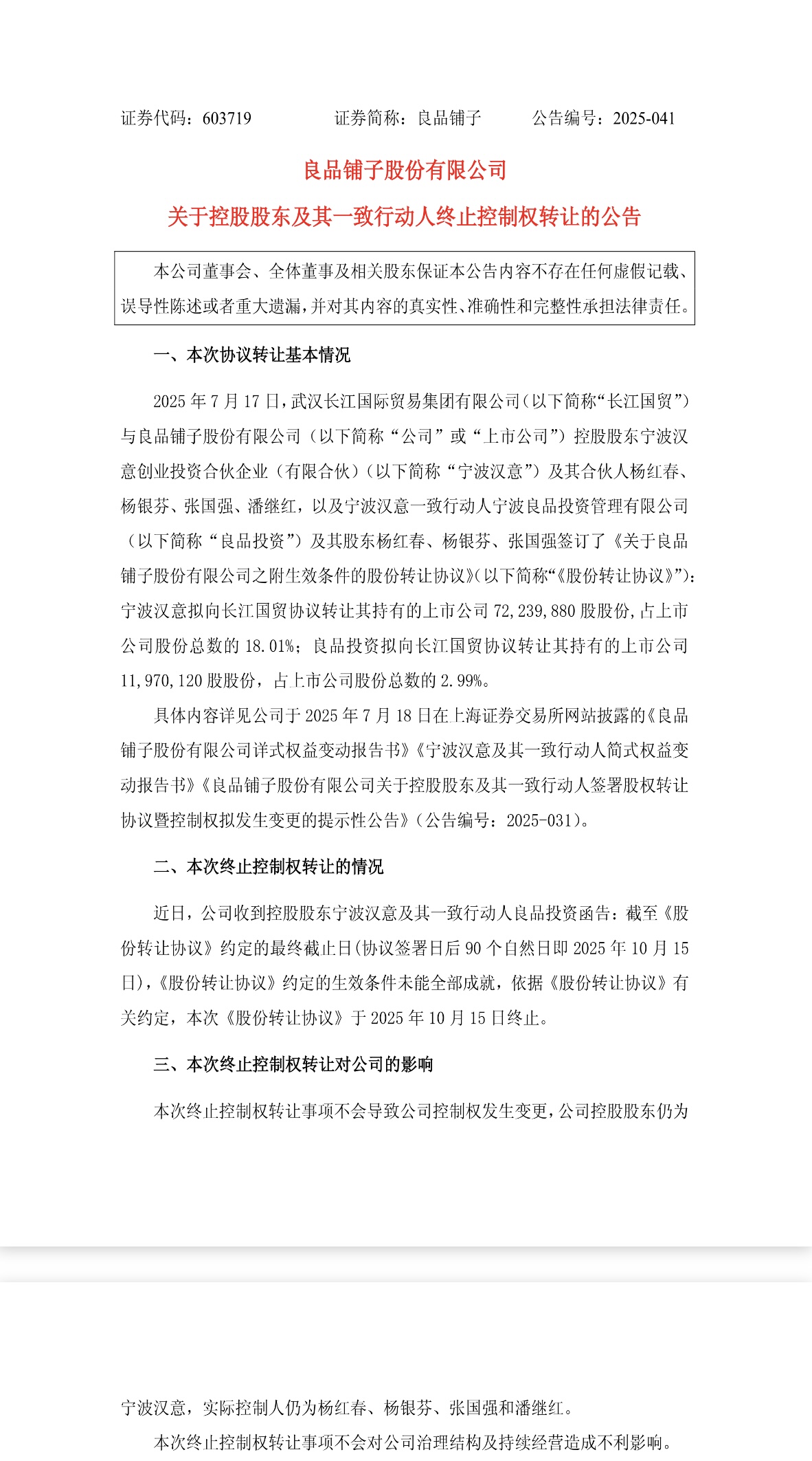 海报新闻记者刘静一10月16日晚间报道,良品铺子公告称,控股股东公司宁波汉益创业投资合伙企业与这些整合主体之间的《股权转让协议》已于10月15日完成。公告显示,终止的原因全部是协议未发生的条件。这也意味着,为期三个月的良品铺子控制权转让正式落空。按照原计划,若交易完成,武汉市国资委将成为良品铺子的实际控制人。公司强调,本次控制权转让的完成不会导致公司控制权发生实际变化,也不会对公司管理架构和持续经营产生不利影响。 10月17日下午,海报新闻记者(报道微信ID:海报新闻sw)多次致电良品铺子董事会秘书办公室询问解约事宜,但无人接听。良品铺子图片来源视觉中国海报新闻记者发现,这场控制权转让风波始于今年7月。良品铺子控股股东宁波汉仪拟将其18.01%股权转让给武汉长江国贸集团有限公司(以下简称“长江国贸”),良品铺子拟转让2.99%股权。若交易完成,长江国贸将持有良品铺子21%的股份,成为新的控股股东。公开资料显示,长江国贸由武汉金控(集团)有限公司100%控股,而武汉金控集团则由国资局、市政府管委会全资控股。这笔交易充满争议哦,开始。早在今年5月,宁波汉益就与广州轻工贸集团就转让事宜进行了谈判,并签署了《协议》以解决自身债务。根据协议,广州轻工拥有5月28日前股权交易的优先购买权。但宁波汉益及整合方未能在约定时间内与广州轻工签署相关股权交易协议。广州轻工提起诉讼并申请财产保护,冻结了宁波汉益在良品铺子的19.89%股权。据此前媒体报道,10月17日,良品铺子店内部人士回应:“作为一家上市公司,我们的首要任务是聚焦核心业务,做好运营。目前,公司各项业务运行平稳,我们将继续做好日常运营和管理工作,努力提升经营业绩和公司业绩。”良品铺子易主的背后,是公司近年来经营状况不乐观。2025年上半年,良品铺子营业收入28.29亿元,同比下降27.21%;归属于上市公司股东的净利润-9355.31万元,同比下降491.59%。 对此,公司解释称,主要是由于产品优化调整、部分产品降价以及优化门店结构、主动淘汰低效门店所致。 10月17日收盘,良品铺子股价报12.38元/股,跌幅2.83%。
