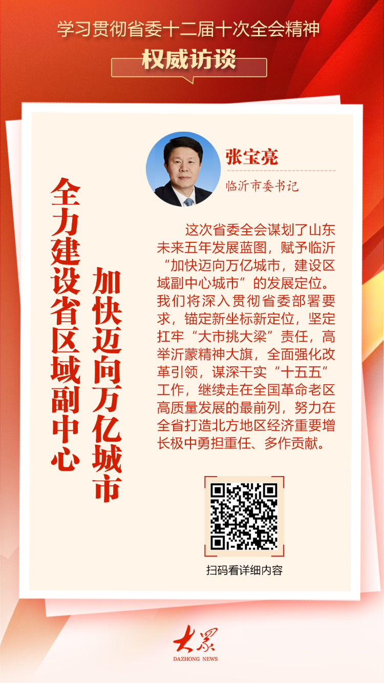 这次省委全会规划了山东未来五年的发展蓝图,给临沂提出了“加快向万亿级城市转型,建设区域性副中心城市”的发展定位。我们将全面贯彻落实省委部署要求,锚定新坐标、新定位,坚定承担“引领大城市”责任,高举沂蒙精神旗帜,全面加强改革领导,深化落实“十五五”工作,继续走在重要发展和革命根据地前列。为打造省北地区经济增长重要支柱,作出更多贡献。一是以标志性产业链为基础的现代产业体系发展,深耕高端不锈钢、广告材料等13条标志性产业链。大力发展特钢、新能源商用车等产业,积极布局未来产业,力争“十五五”末工业总产值突破1.3万亿元。二是通过商城国际化、数字化打造对外开放新山,全面落实省政府支持临沂商城高质量发展22条意见,大力推动商城和企业走出去,加快建设国际商品集散中心和国际物流枢纽中心。三是优化营商环境促进民营经济发展,深化做强品牌、培育企业家等“环动”,努力为企业降本增效,推动临沂从民营经济大市迈向民营经济强市。第四是要强调加强科技创新,构建系统的科研生态系统,推进“1+13+X”产业技术研究体系建设,积极谋划“人工智能+”发展,培育更多新生产力。五是发展以交通物流为主的枢纽经济,统筹交通、产业、城市、人口,建设国际陆港、机场、疏浚港等六大货运枢纽群,推动交通运输向要素枢纽、产业枢纽转变。六是以文旅融合赋能消费,将红色文化旅游、城市文化旅游、体育文化旅游等“1+7”文化旅游结合起来,打造鲁南苏北区域消费中心城市。七、以农村建设引领乡村振兴e区,五年全覆盖,五年进一步完善,不断打磨齐鲁模式沂蒙品牌。经过五年努力,我们加快建设“实力雄厚、活力充沛、开放包容、文化繁荣、宜居宜业”的省区副中心城市。 (大众新闻记者杜惠生编译)